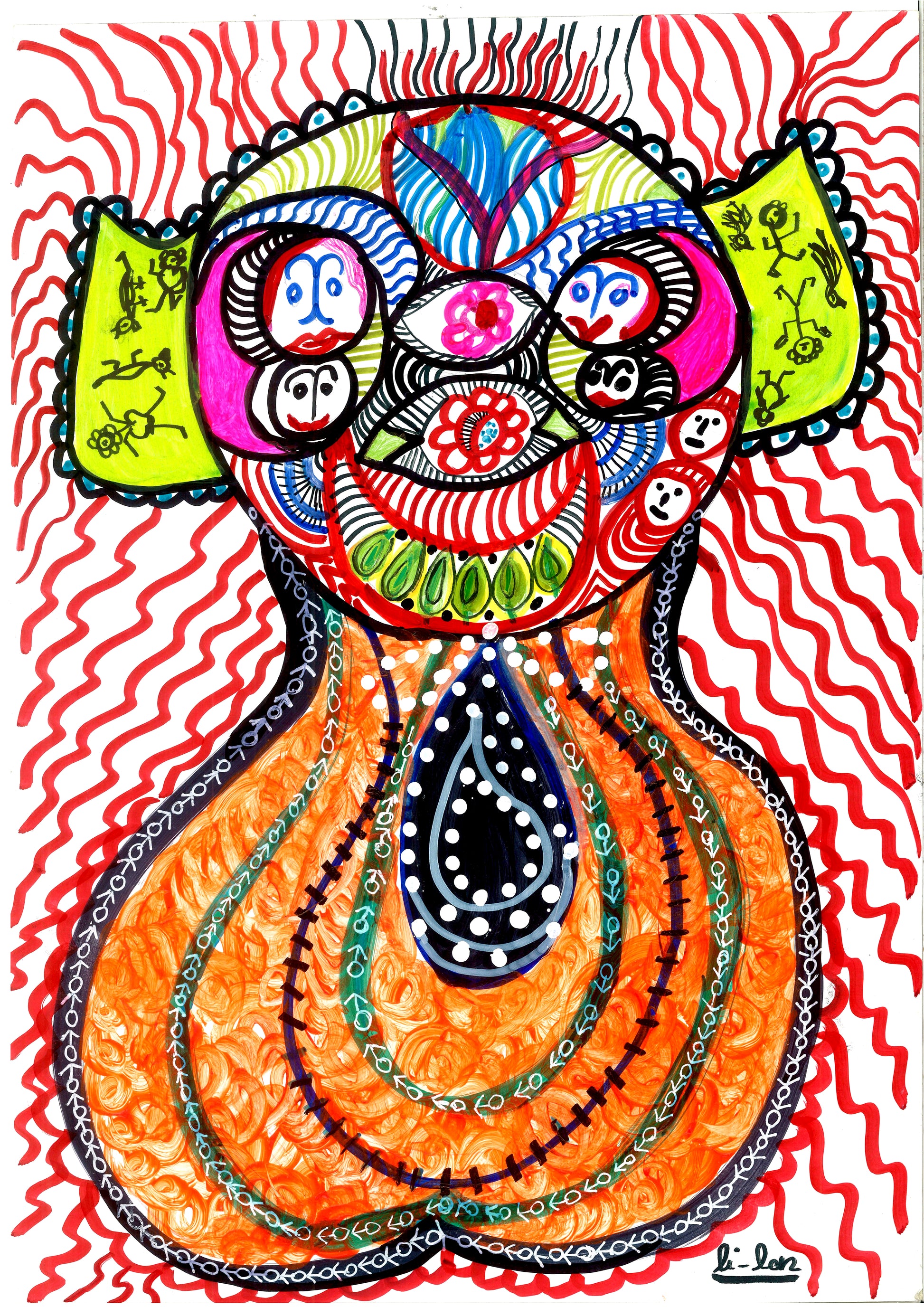 Colored pencil, acrylic and markers on cardboard