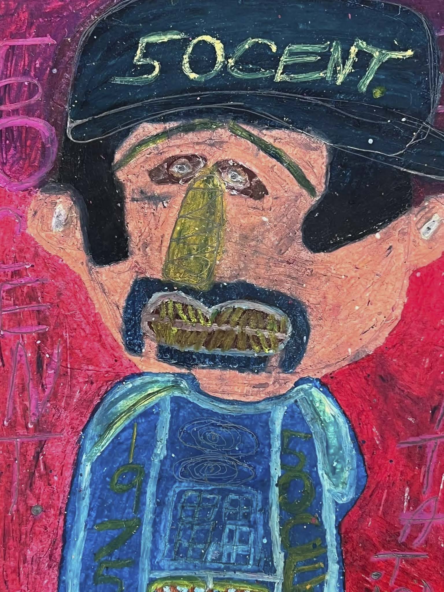 Working primarily in portraiture, Tim depicts his favorite media personalities, athletes, and entertainers. His emerging nonconformist style combines humor, honesty, and insight, transforming familiar icons into reflections on society and racial perception. Each drawing captures the essence of its subject through a vivid mix of pencil and oil pastel, blending precision with expressive color.